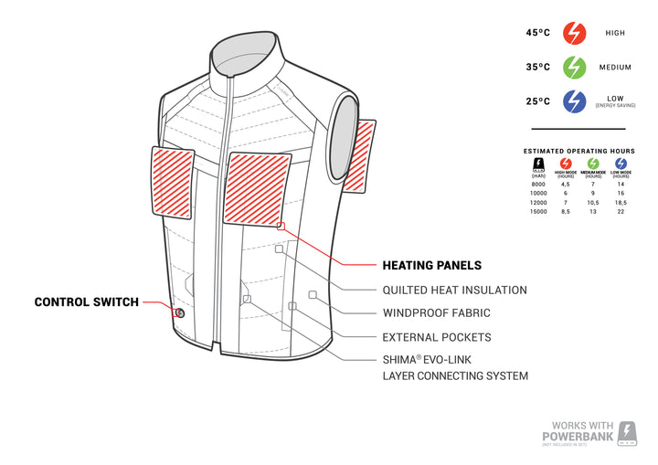 SHIMA POWERHEAT ger komfort när standardisolering inte räcker. Den elektriska västen värms upp av specialpaneler placerade på viktiga platser för att säkerställa optimal temperatur för kroppen. Produkten är avsedd att användas med Power Bank, som enkelt kan anslutas till en USB -kabel gömd i en dedikerad ficka.
