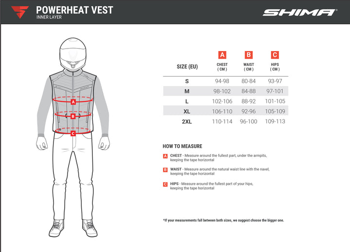 Västen har 3 uppvärmningsnivåer som kan justeras med kontrollknappen. På så sätt hittar du alltid den inställning som passar dig. Den diskreta passformen och den lätta konstruktionen gör SHIMA POWERHEAT till ett bra komplement till en jacka, inte bara när du kör motorcykel.