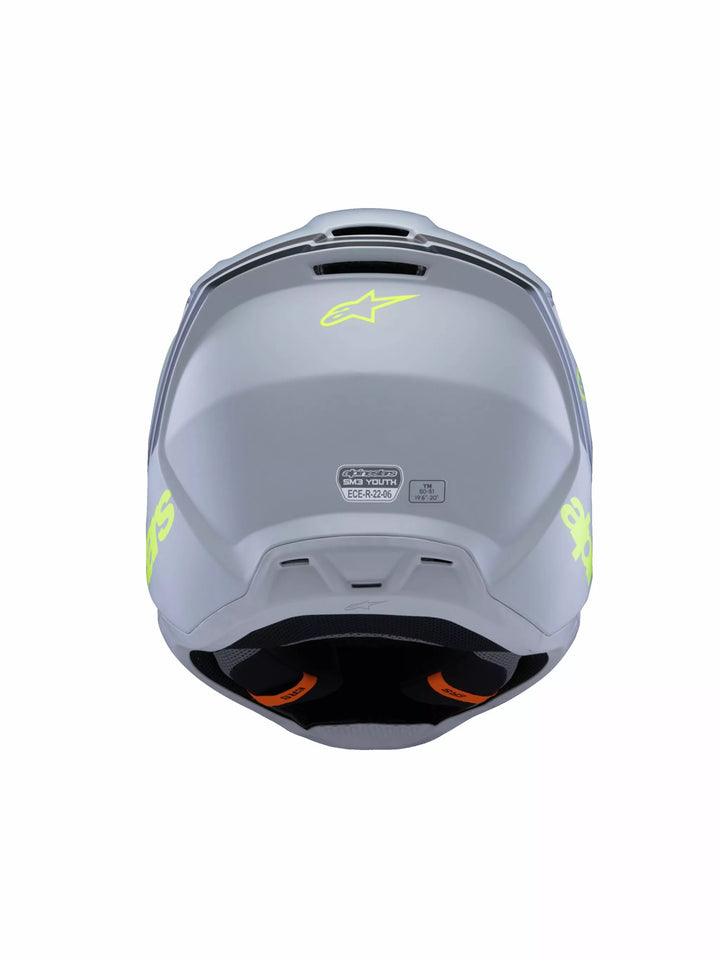 Anatomically engineered and profiled specifically for youth and younger riders, the all-new SM3 Youth Helmet is optimized for mx, enduro and off-road use., This lightweight helmet features a thermo-incted shell incorporating a special polymer blemer blender To Deliver the Optimal Combination of Impact Protection and Light Weight., Lightweight Outer Shell is Construct from a Technologically Advanced Impact Resistant Thermoplastic In Three Sizes (Youth Small, Youth Medium and Youth Large. Rider's Head Thanks To The Helmet's Crown and Cheek Pads, Which Are Available as Genuine Spare Parts In Different Thicknesses., Youth Medium and Youth Large Sizes Share The Same Eps Size, Which Heym Size To In Initally Youth Large Size As They Grow via The Crown and Cheek Pad Spare Parts., The Youth Small Has A Smaller Eps Size and Can Be Customized Only Via The Cheek Pads. Old, and Thefore they Require a dedicated Helmet Fit., Multiple Density Inner Liner Ensures The Helmet Is Equipped With The Corract Density In The Corract Area For Enhanced Impact Absorption, While Also Helping Reduce Overal Weight Effects of Oblique Impacts., Alpinestars Patented Low Friction Is Applied to the Inner Part of the Main Eps Liner to Reduce the Rotational Acceleration Forces That Can Result From Certain Oblique Impacts. friction cerebrospinal fluid, which is the body's natural defense against oblique impacts., patent visor release systems the visor is released with the correct pre-determined amount of force, effective analy reducing the ride the rider is constructed using recycled materials for a lower carbon footprint., Hydration tube channels are integrated into the helmet's cheek pads for convenience and performance., Safety, alpinestars has introduced a new in-house standard for the sm 3 youthouse The homologation standard, and in order to pass the alpinestars' New Standards, The Shell Thickness and the Structure of the Helmet Design Itself Have Both Been Optimized on the Chin Area for Superior Impact Performance., Equipped with an emergency release system and removable. Pads while the helmet is still on, while the 3d contoured foam enures rider comfort., Soft textile chin strap is 25mm for optimal safety and rider comfort., stainless steel d-ring sillure a tight and secure fit. 10 Inlets and Seven Exhaust Ports., The Visor Has Been Designed to Direct Air Into the Ports for Enhanced Airflow.
