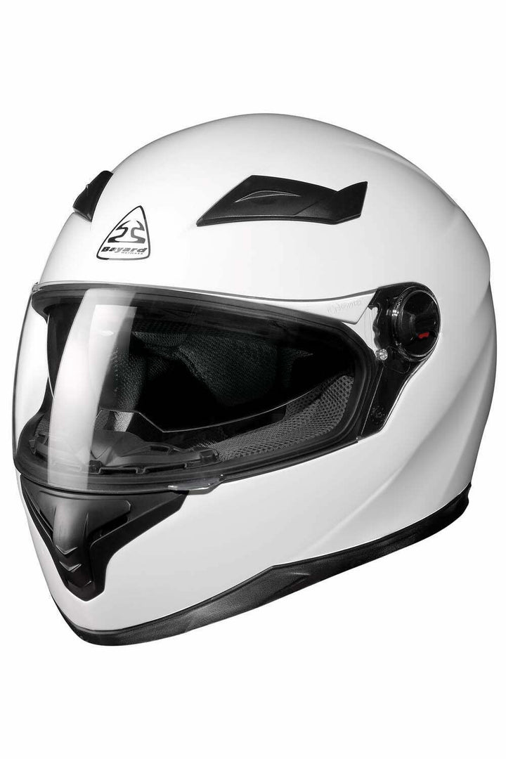 Sporty full-face helmet made of fiberglass with integrated sun protection.