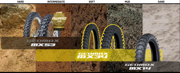 Aspect_ratio: 100.0 Ground: Medium-Soft-Mud Homologation: NHS (Not for Highway Service) Position: Rear Rim_diameter: 16 Speed_index: M < 130 km/h Tire_category: MX, SX Tire_family: Motorcycle & Scooter Tires Tire_load_index: 51.0 Tire_pattern: GEOMAX MX34 Tire_Structure: X-Ply Tire_width: 90 Tubeless_or_Tubetype: TT - Tubetype Tyre_compound: Mid-soft