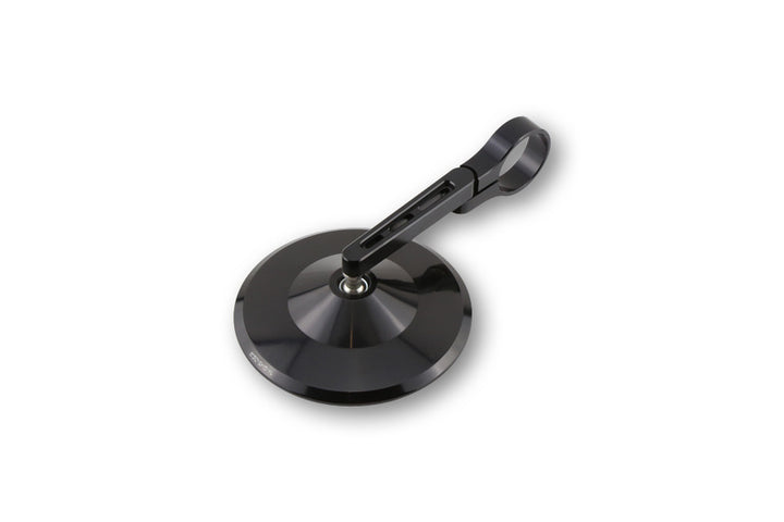 A universal handlebar end mirror with a noble design, equipped with a rounded head in black anodized aluminum. In the second generation of the popular Highsider MONTANA handlebar end mirror, the mirror arm has been changed in both length and shape. The mirror arm features three stylish air vents and is shorter than the first generation. A hinge on the clamp provides extra adjustment options to optimize visibility.
