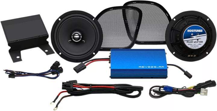 Complete Kit With 225 W AMP AND GEN 4 6-1/2 "Front Speakers, features R.E.I.I.T. Circuitry for Excellent fm reception from a class d amp, including Hogtunes Model Special Replacing Is The Therapy Wires, All Required Plugs Included, not compatible with CVO Models with factory amplifiers installed., No Radio Flash is Required.