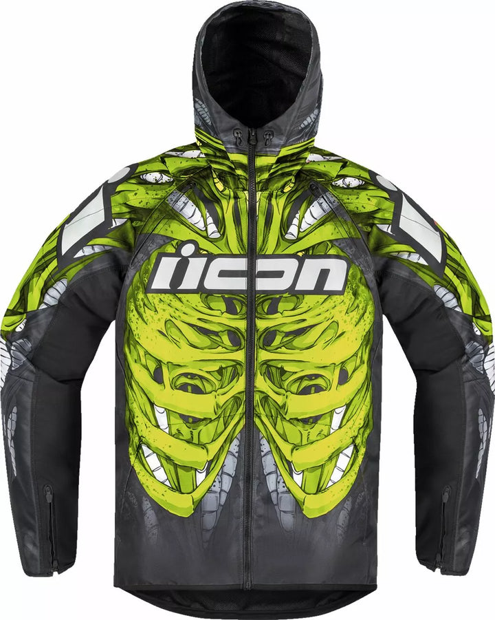 AirForm Manik'r ™ Graphic on Front and Back of Jacket, 420D Polyester Chassis With 300D Polyester Internal Reinforcing, PU-Coated Shell Material with DWR Finish, D30® Removable Viper Back Protector; Elbow and shoulder Impact Protectors, Bungee Cord Style Drawstring Hood, AirFly ™ Center Front Mesh Panel with Chest and Back Zippered Vents, Vented Cuff Zippers, Back Protector en 1621-2 Level 1