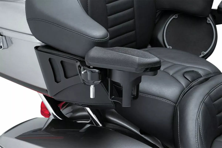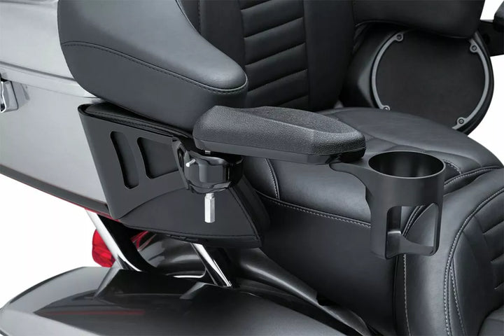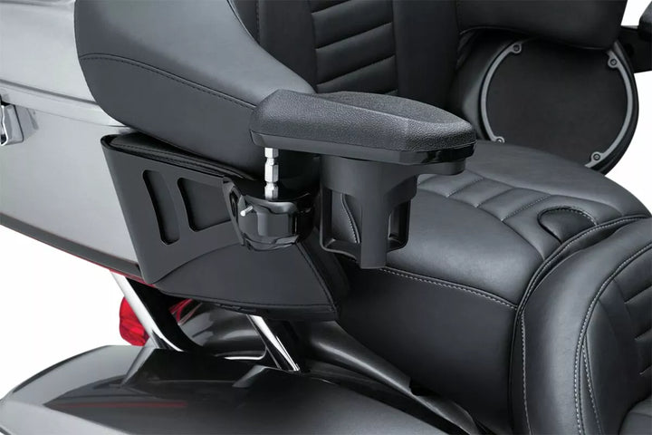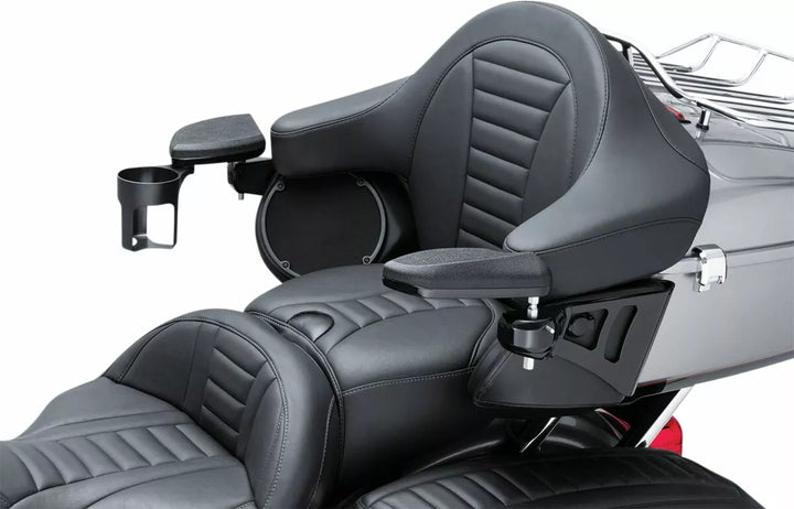 Armrests Can Be Adjusted Vertically and Rotated Out of the Way When Mounting and Dismounting, Remove The Armrests With A Simple Push of A Button When Not Needed, Mounting Bracket Conveniently Mounts Betwees The Tour-Pak and Speaker Husing Complements Other Factory Components, Includes One Cup Holded on the right side - Supplied Cup Holder Can Be Moved to Left Side
