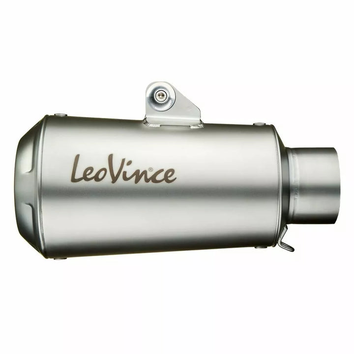 LV-10 Slip-on Muffler Stainless Steel With Racing DNA, AISI 304 Stainless Steel, Shot Blasted End Cap, Matte Finishing, Rear Stainless Steel Mesh, Laser Etched Leovince Logo, Laser Cut Bracket, High Temperature "