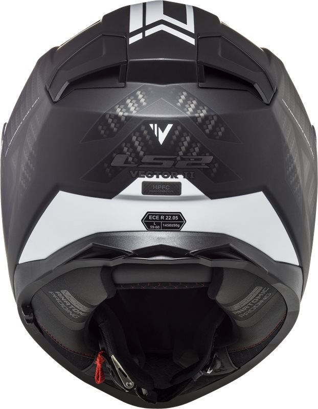 Baksida av LS2 Integral Mc-Hjälm Vector II Tron Svart/Vit med modern grafik, ventilationssystem och ECE-certifiering för säkerhet.