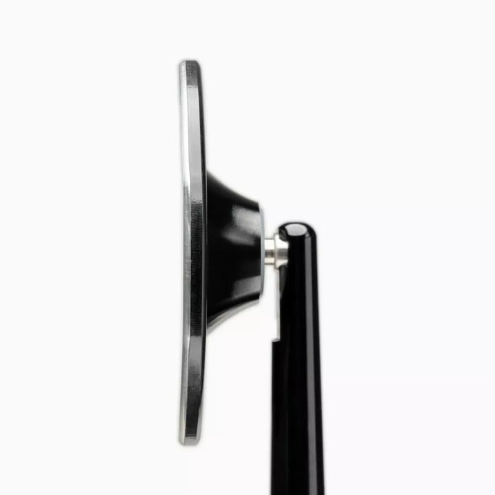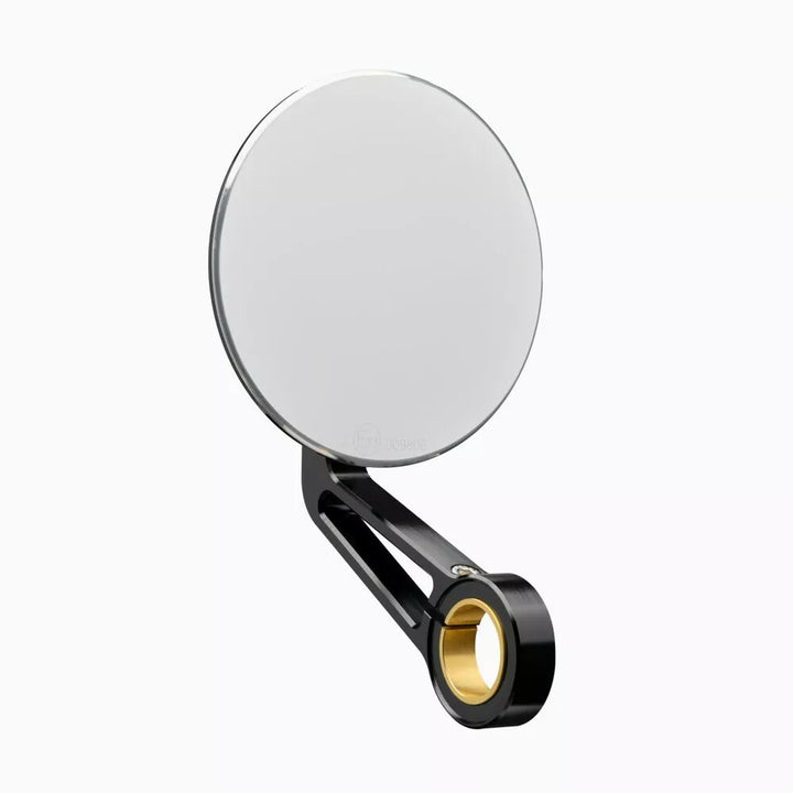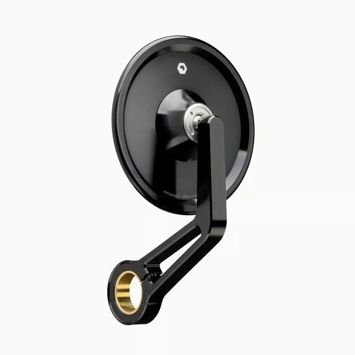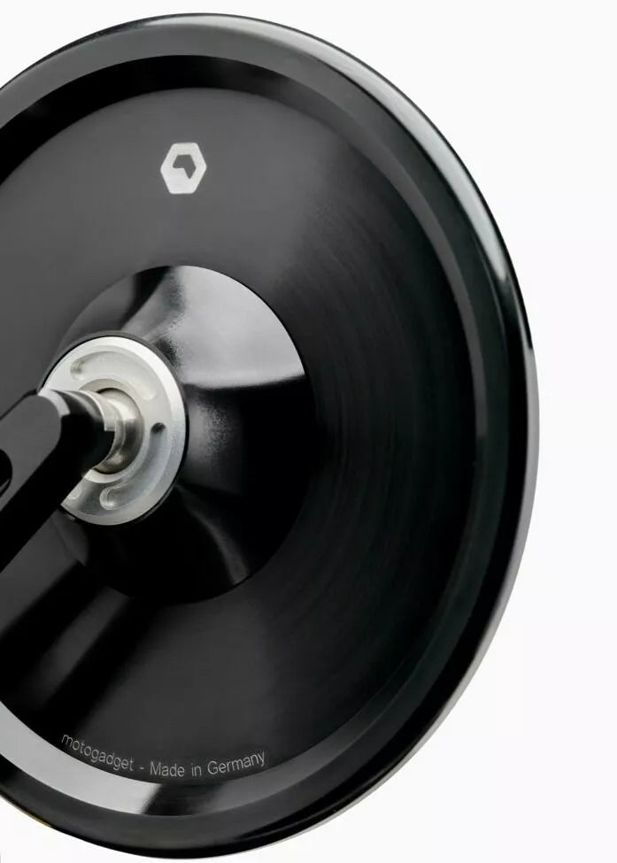 The Handlebar End Mirror in Classic Round Design Can Be Mounted Above or Below the Handlebar. The Angle of the Mirror Arm Is Rigid., Our Glasless Mirror Series Mo.view is Unique Worldwide. The Special Feature of Our Mirrors is the Patented Mirror Surface, Which is Made Directly from the Metal of the Body., The Aluminum Itself is the Mirror Surface!, The Mirror Body Itself is Very Thin and Light, Creating a Weights Design With A Weights Design With A Weightly Cutting Using Diamond Tools On Ultra-precision Machines in Berlin. It is then made resistant to oxidation, corrosion and abrasion by an elaborate plasma coating in a vacuum., The Mirror Body, Mirror Arm and the CLAMP FOR THE HANDLEBAR END ARE MILLED ON CNC MACHINES FROM THE SOLID ALUMINIUM AND ANODIZED HIGHTEOD HIGH QUALITY. All Screws are Made of Stainless Steel. The precise Ball Joint Allows The Comfortable and Very Stable Adjustment of the Mirror., Glass Breakage or Glass Falling Out is Simply Not Possible!, The Handlebar End Mirror Can Be Mounted Above or Below the Handlebars. The small arm can be swivelled. The Mirror is suitable for the right and left side. It can be mounted directly on the handle bar end (22 mm and 1 inch) or, if the grips and fittings cannot be moved, using the mo.view bar adapter., Diameter of the mirror body: 99 mm., Thickness of the mirror Body without ball head: Diameter: can be used for 22 mm and 1 inch handlebars., CLAMP WIDTH: 12 mm., Weight: 142 g., Scope of Delivery: 1x Rear-View Mirror Mo.view Classic 130 (With Ece Marking) With Arm, 1X CLAMP & INSTRUCTIONS MANUAL.