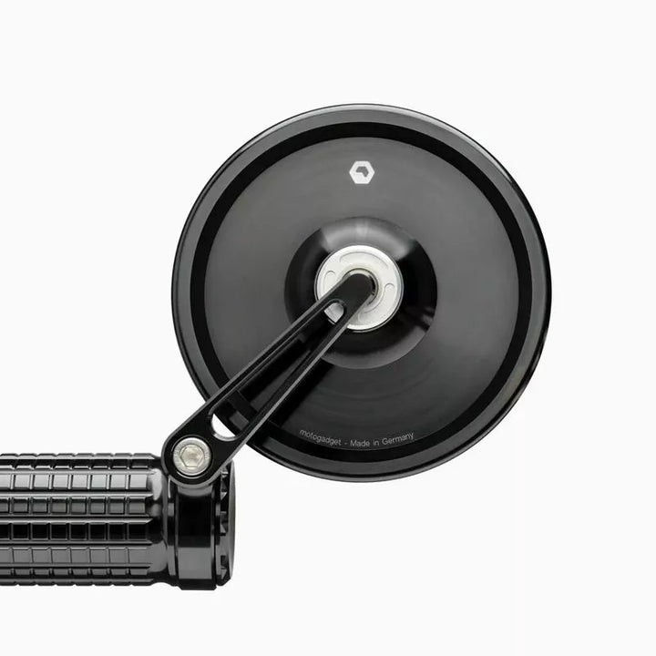 The Handlebar End Mirror in Classic Round Design Can Be Mounted Above or Below the Handlebar. The Angle of the Mirror Arm is Individually Selectable., Our Glasless Mirror Series Mo.view is Unique Worldwide. The Special Feature of Our Mirrors Is The Patented Mirror Surface, Which Is Made Directly From the Metal of the Body. The Aluminum Itself is the Mirror Surface! The Mirror Body Itself is very Thin and Light, Creating a Weightless Design Without A Rim or Frame., The Convex Mirror Surface is produced by Fly Cutting Using Diamond Tools On Ultra-precision Machines in Berlin. It is then made resistant to oxidation, corrosion and abrasion by an elaborate plasma coating in a vacuum., The mirror body, mirror arm and the clamp for the handleable end are milled from solid aluminum on cnc machines and anodized to a high quality. All Screws are Made of Stainless Steel. The precise ball joints the mirror to be adjusted Comfortable and very stable. Glass Breakage or Glass Falling Out is Simply Not Possible!, The Handlebar End Mirror Can Be Mounted Above or Below The Handlebars. , The small arm can be swivelled. The Mirror is suitable for the right and left side. It can be mounted directly on the handleable end (22 mm and 1 inch) or, if the grips and fittings cannot be moved, using the mo.view bar adapter., Diameter of the mirror body: 99 mm., Thickness of the Mirror Body Without Ball Head: Diameter: Can be used for 22 mm and 1 inch handlebars., CLAMP WIDTH: 10 mm., Weight: 125 g., Scope of Delivery: 1x Rear-View Mirror Mo.view Classic 60 (With Ece Marking) With Arm, 1x Clamp & Instructions Manual.