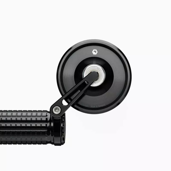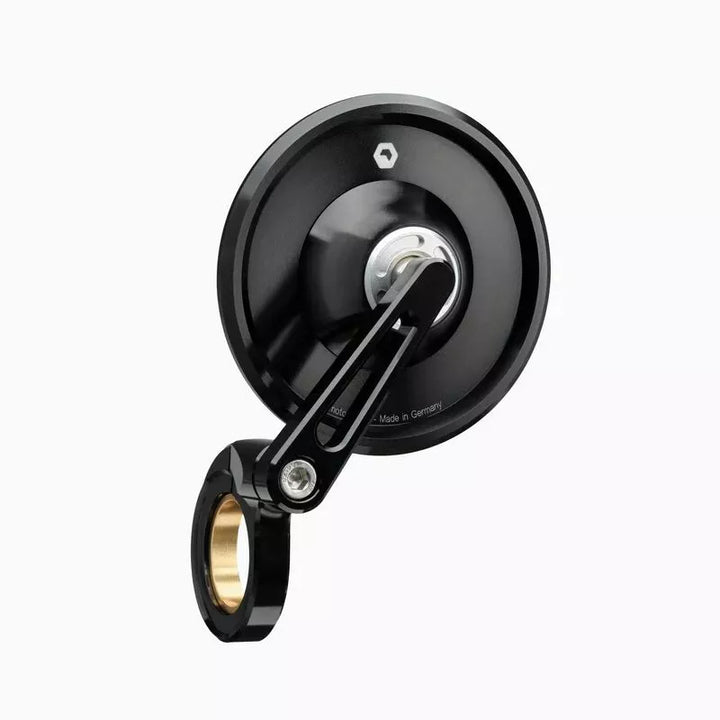 Our Glasless Mirror Series Mo.view is Unique in the World. The Special Feature of Our Mirrors is the Patented Mirror Surface, Which Is Worked Directly From the Metal of the Body. The Aluminum itself is the Mirror Surface., The Mirror Body Itself Beces Very Thin and Light, Creating a Weightless Design With No Rim or Frame. The Convex Mirror Surface is Manufactured by Flycutting Using Diamond Tools On Ultra-precision Machines in Berlin. I, then made resistant to oxidation, corrosion and abrasion by a complex plasma coating in a vacuum., The Mirror Body, Mirror Arm and the CLAMP FOR THE HANDSLABAR END ARE MILLED FROM SOLID ALUMINUM ON CNC QUALITY. , All Screws are Made of Stainless Steel. , The precise ball joint enables the convenient and very stable adjustment of the mirror. Glass Breakage or Glass Falling Out is Simply Not Possible., The Handlebar End Mirror Can Be Mounted Above or Below the Handlebar. , The small arm can be swivelled. , The Mirror is suitable for the right and left side., Mounting is Directly on the Handlebar End (22 mm and 1 inch) or if the Grips and Fittings Can Not Be Moved, Using the Mo.view Bar Adapter., Mirror Body Diameter: 75 mm. Mirror Arm: 61 mm., Clamp Diameter: Can Be Used For 22 mm and 1 inch Handlebars., CLAMP WIDTH: 8 mm., Weight: 86 g., Scope of Delivery: 1 x Mo.view Spy Mirror with Arm, 1 x Clamp & Mounting instructions.