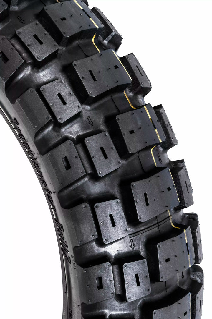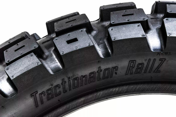 Based on the popular tractionator adventure but with more aggressive off-road traction in all weather extremes., Off-road performance with reasonable on-road manners., Tested and sample construction and compound for adventure and rally use. Without the Need to Change Tyre Pressures Between Off Road and On Road., Self-cleaning and self-sharpening Tread Pattern Gives Excellent Predictability and Power Delivery., Hybrid to coastal Compound with Silica for Optum Grip in Mud and Snow. Forests and Fire Trails., Rallz Also available in Range of Tube Type Adventure Sizes for Light Weight Adventure Bikes.