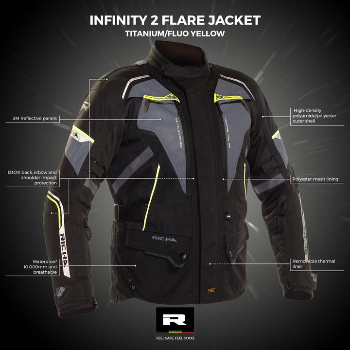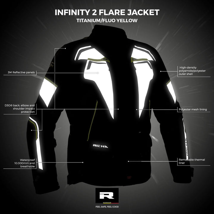 Perhaps the most versatile motorcycle jacket you will ever own! The 3-in-1 technology makes this jacket your ideal commuting partner: You can wear it every day and wash the jacket whenever you want. D3O protection along the shoulders, elbows and back guarantees your safety in the case of shock, breast protection is optional. To exit everything introduces Richa infinity 2 flare-The jacket A new era in visibility technology with 3M reflection that lights up day and night.
