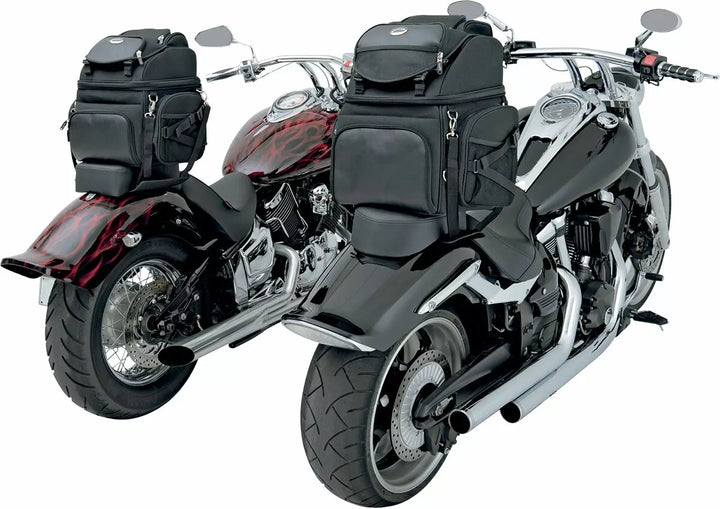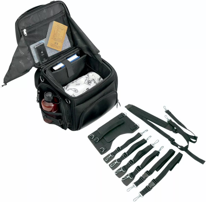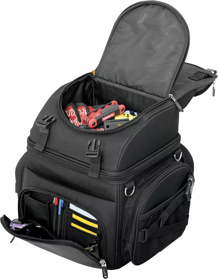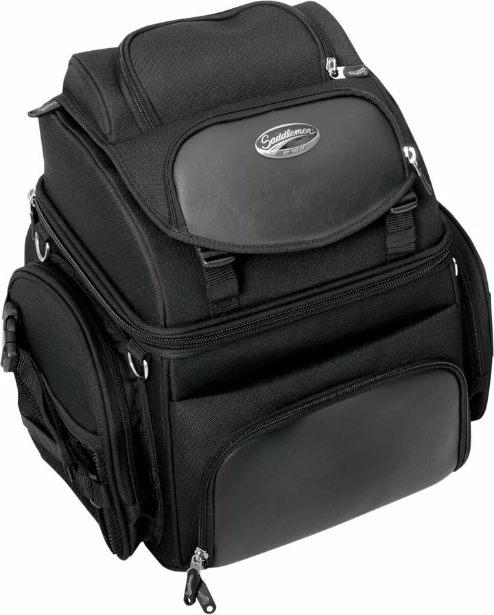 Two Mounting Systems Included: Saddlemen's "Versa-Mount" under-seat Yoke and Harness, and an Adjustable Sissy Bar Strap System that Easily Attaches Bag to Your Motorcycle's Seat, Luggage Rack or Sissy Bar, Backrest Pad Can be Adjusted Detachable Backpack Straps for Easy Off-the-Bike Jaunts, Include Another Large Top-Loading Main Compartment with Internal Organizer Pocket, Five External Pockets, Two of Which Can Be Expanded for Added Capacity, Five Internal and Two Outer Mesh Pockets The Elements, Top Exterior Flap Can Be Adjusted to Carry A Jacket, Mini-Padlock, With Extra Keys, Helps Secure Your Belongings In The Bag, Internal Structure Maints Bag Shape and Is Strong Enough to Lean On, Even When WEPS 11 " Inches Cargo Capacity; Holds One 3/4 Helmet Plus Other Cargo, No Sissy Bar Required, EU Measurements 27.94 cm Width x 38.10 cm Height x 25.40 cm Depth.