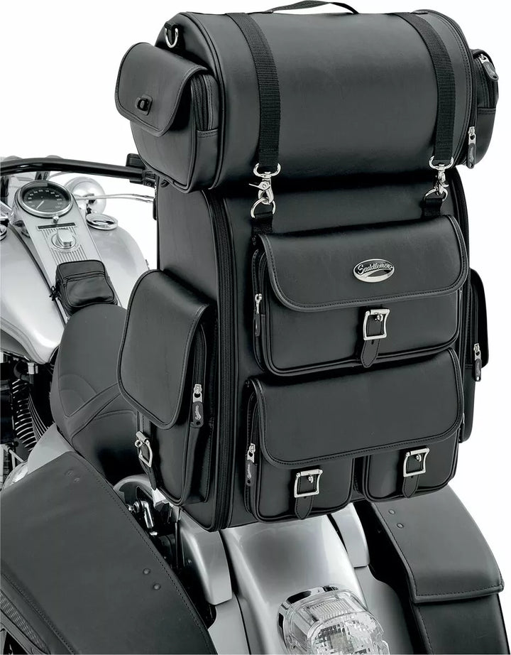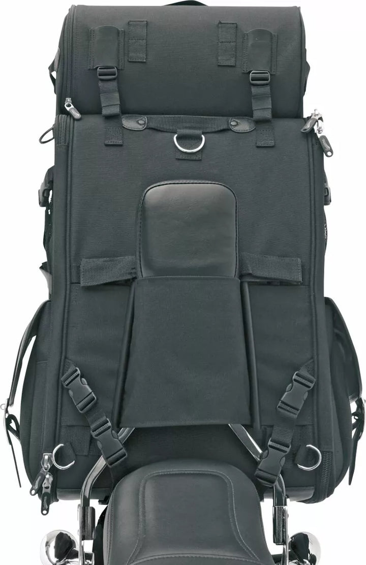 Two Full Side Openings Allow Easy Access to Bag Contents while bag is still mounted on bike, fully Adjustable sissy bar mounting system goes on in seconds over any size and style sissy bar pad; Once Adjusted for Your Size Pad, You Never Need To Adjust It Again, Rigid Construction Provides Rider Support and Can Be Leaned Back On When Mounted on Backseat, Multiple Exterior Pockets, Internal Adjustable Shelf, Raincover Leaf, constructed, constructed of Included for Extra Cargo Capacity, Dimensions: Sissy Bar Bag 15 "W X 18" H X 8 "D With Roll Bag 14" W X 8 ᄑ "H X 8 ᄑ" D
