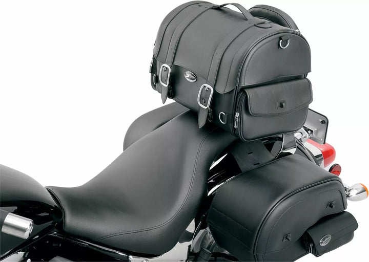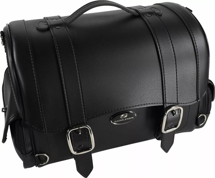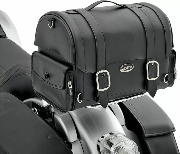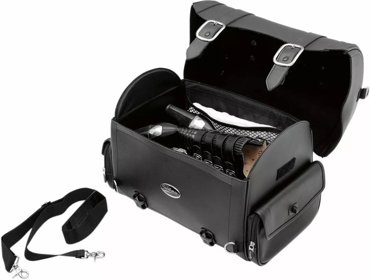 Sleek-Styled Tail Bag Featuring Straps and Large Chromed Buckles, Lockable, Quick-Rlease Buckles Hidden Below Large Chrome Buckles, Made of Rugged Leather-Grain SaddleHyde ™ and Plastic Reinforcing Panels, Rigid Construction KEEPS THESE BAP Mounting Options Adaptable to any bike; Attaches to Sissy Bar, Rack or Atop Passenger Seat, Easy-to-USE Sissy Bar Strap Included, Adjustable Bungee Straps Sold Separately; Multiple Anchor Points, Including Four Heavy-Duty Chromed D-Ring and Several Strap Slots Provided for Fast, Easy Mounting, Rived Top Handle and Removable Shoulder Strap for Convenient Transport Off The Bike, Hat-Box Style Long Sides Protte Easy-Open Lid Provides Convenient Access, Two Zippered and Flap-Covered Side Pocket Extra Storage, Hanging Internal Mesh Pocket Provides Separate Storage Inside Bag and Helps Organize Contents, Measures 16 "L x 10¼" W x 12½ "H: 19" L WH POW "