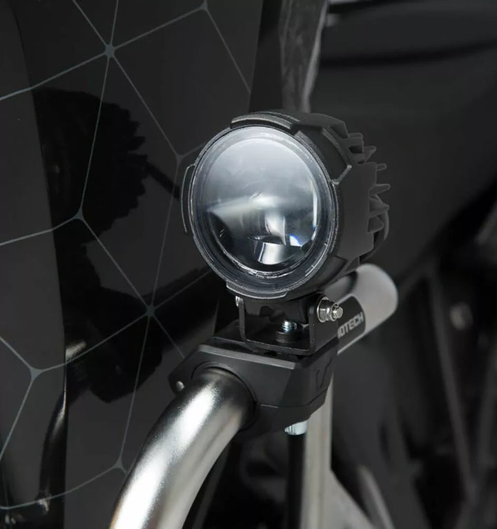 EVO High Beam Lights are ideal for riding long distances in/off road conditions where maximum beam distance is desired to increase visibility and safety, evo lights represented outstanding design, high-quality standards and reliable waters and dust protection (IP69) Trouble-free and maintenance-free operation for years, Trouble-free and maintenance-free operation through wear-free LED, Consuming Significant Less Power, Input Voltage: 12 V DC, LED: 12 W (Per Light), Luminus Flux Flux Outer diameter: 7.1 cm, Water and Dust Proof (IP69), Connects Directly to the Motorcycle, No Changes on the Motorcycle Electric Necessary, Weatherproof, Illuminated Blue Handlebar Switch for Easy Hand 27, 28 mm) or on bike-specific light Mounts for Frame Mounting (Sold Separately), Included: 2 Evo High Beams, Cable Harness with Fuse, Switch, Mounting Material