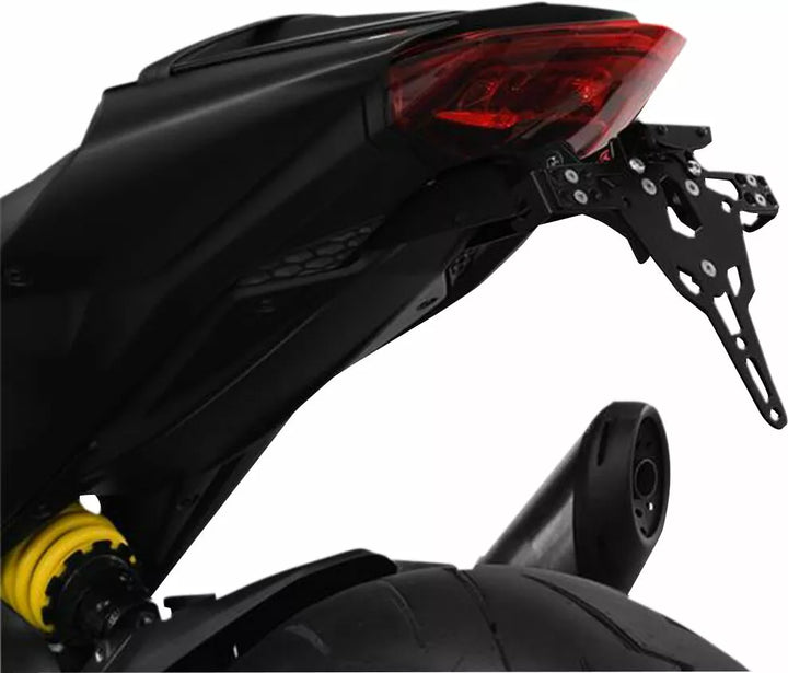 The License Plate Holder is Extremely Durable and Weather Proof., Black Powder Coated. , The License Plate Holder Can Be Used For Any Kind of License Plate (175mm Width)., No Modification of Fairing Required., Stepless Adjustment of Rake Angle., Indicator Support Adjustable in 3 Positions. Plate., Special Indicator Light Mounts (Sold Separately) Required for Stock Indicator Lights., Kit Includes: 1 License Plate Holder Incl. Mounting Kit., LED License Plate Light "E Approsved" Incl. Support., Back Light With Support. Of: Germany, Slovenia, Croatia & UK.