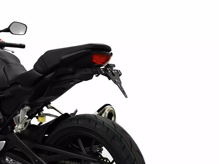 The License Plate Holder is Extremely Durable and Weather Proof., Black Powder Coated. , The License Plate Holder Can Be Used For Any Kind of License Plate (175mm Width)., No Modification of Fairing Required., Stepless Adjustment of Rake Angle., Indicator Support Adjustable in 3 Positions. Plate., Special Indicator Light Mounts (Sold Separately) Required for Stock Indicator Lights., Kit Includes: 1 License Plate Holder Incl. Mounting Kit., LED License Plate Light "e Approved" Incl. Support., Back Light With Support.