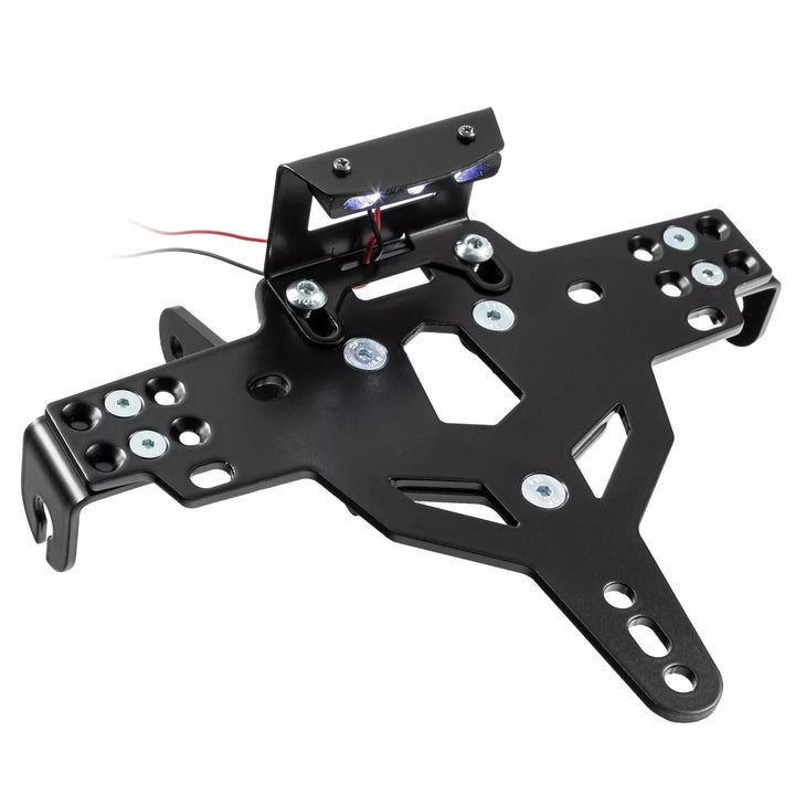 The License Plate Holder is Extremely Durable and Weather Proof., Black Powder Coated. , The License Plate Holder Can Be Used For Any Kind of License Plate (175mm Width)., No Modification of Fairing Required., Stepless Adjustment of Rake Angle., Indicator Support Adjustable in 3 Positions. Plate., Special Indicator Light Mounts (Sold Separately) Required for Stock Indicator Lights., Kit Includes: 1 License Plate Holder Incl. Mounting Kit., LED License Plate Light "e Approved" Incl. Support., Back Light With Support.