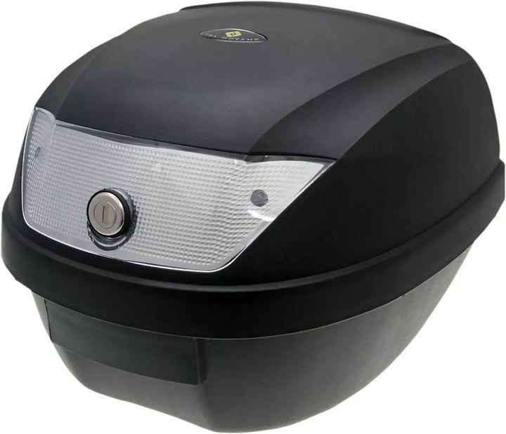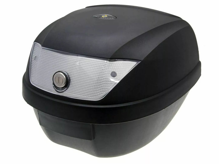 Universal top box, Black plastic, with lock. Supplied with 2 keys and fitting base, Easy to secure to your vehicle and quick release.