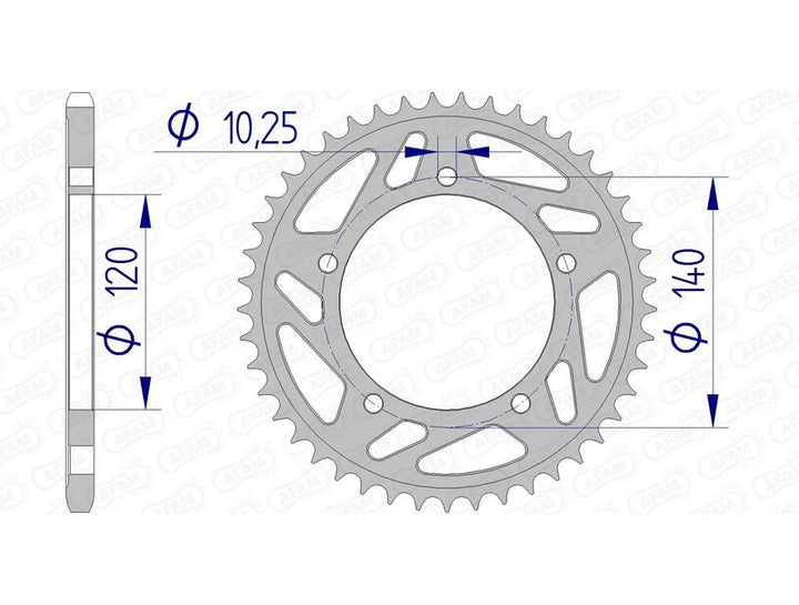 AFAM aluminium crown gears are made of an alloy that is both light and tough. The quality of machining and the precision of the cutting make AFM a worldwide standard-setter for motorcycle transmission parts. Racing aluminium crown gear Ultra-light with hard anodizationReinforced resistance to friction and wearRange-topping finish and qualityEssential for competitive riding Chain_pitch: 520.0 Material: Aluminium Rear_sprocket_teeth_count: 46.0 Rear_sprocket_type: 15605 Rear_sprocket_version: Ultra-light hard anodized