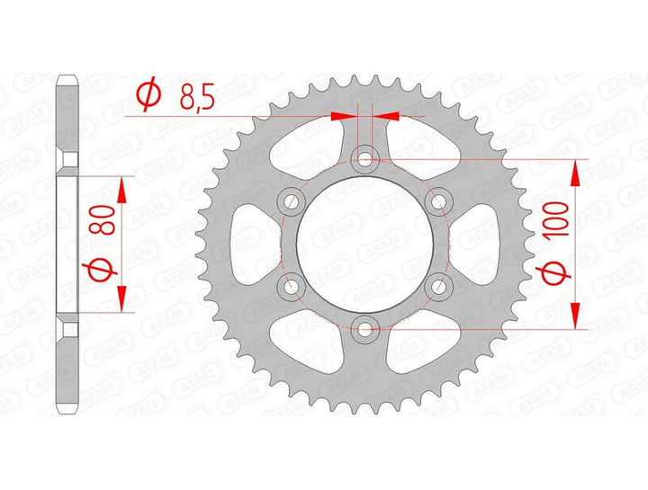 AFAM steel rear-sprockets are machined from C45 steel, and are then treated to higher hardness and even resistance. The high-quality manufacturing process and the cutting precision made AFAM a world leader for motorcycle transmission parts. Steel rear sprocketTop of range manufacturing and qualityContributes to transmission kit durability Chain_pitch: 420.0 Material: Steel Rear_sprocket_teeth_count: 48.0 Rear_sprocket_type: 80103 Rear_sprocket_version: Standard