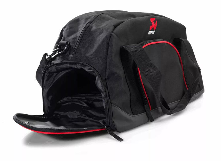 Made in collaboration with the renowned Ogio brand and constructed using durable and long-lasting materials., The dome shape can accommodate shoes in a specially ventilated compartment, Features a front zippered pocket, Padded shoulder strap, All-metal hardware, and a fabric-wrapped handle., Styled in black with red detailing and a discreet Akrapovic logo., 30 × 60 × 63 cm