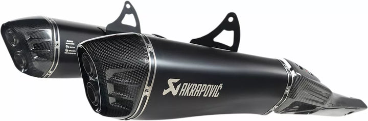 Slip-on mufflers represent the first step in the exhaust tuning process, Easy to install and offers a great balance between price and performance, More power, more torque, less weight and the unique Akrapovic sound, These mufflers weigh in at 31.6% lighter than stock, Constructed from a black-coated lightweight titanium outer sleeve on the mufflers and high-grade stainless steel link pipes, along with carbon fiber end caps and carbon fiber heat shields