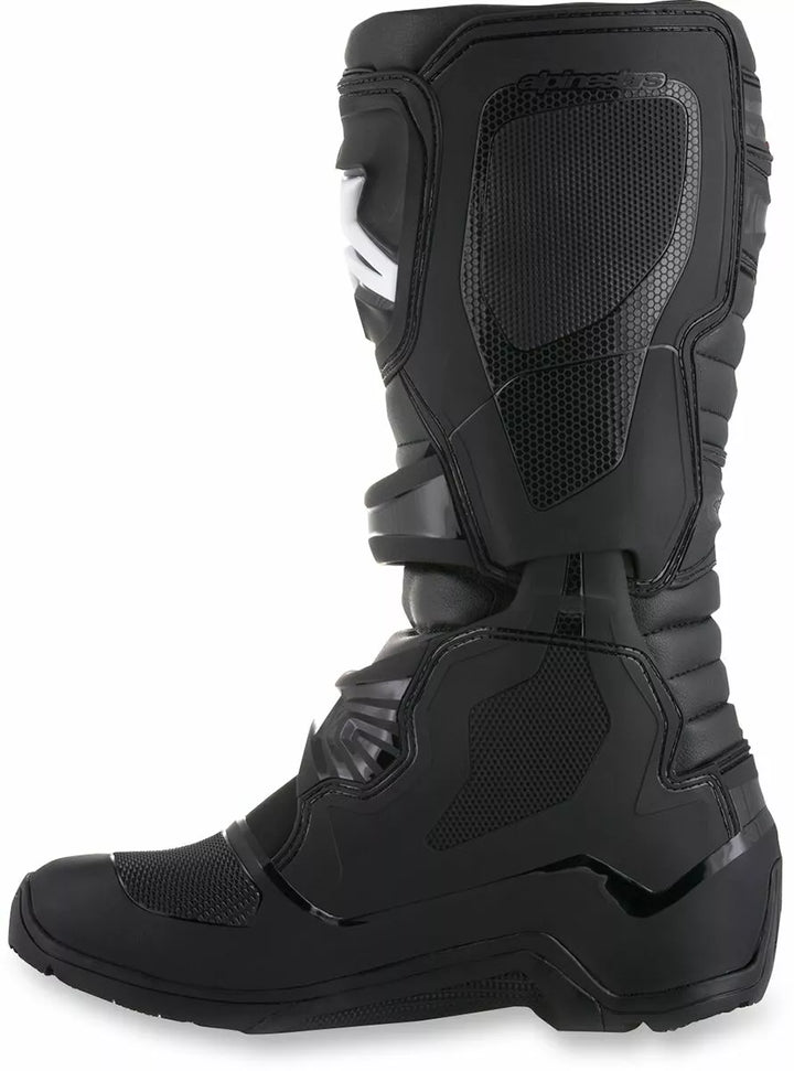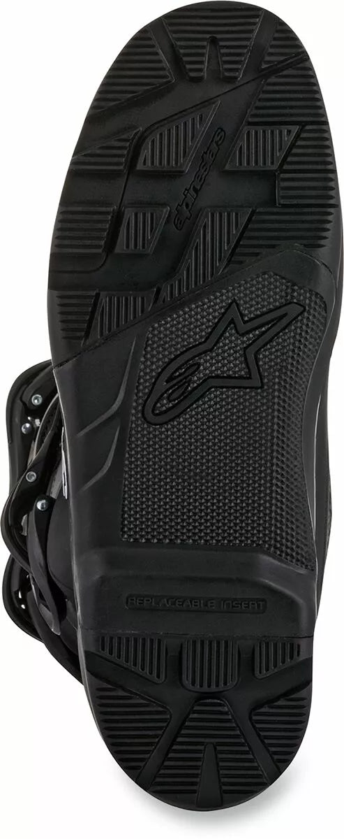 Boot upper construction is an innovative, lightweight microfiber material that is flexible and abrasion-resistant, Light microfiber on front and rear bellows provides a more comfortable flex area, Toe box is made of synthetic material for high abrasion resistance, Extended Polyurethane (PU) synthetic gaiter helps seal out water and dirt, Contoured Thermoplastic Polyurethane (TPU) calf guard, TPU higher medial guard, TPU outer lateral ankle guard and TPU heel counter for support and resistance to impacts, Rear TPU gaiter patch applied on the top of the TPU calf protector for comfort and impact resistance on the rear flex area, Injected TPU shin plate is connected with the TPU medial guard panel, Hook-and-loop upper boot closure with TR flap that provides a wide range of fit and support, TPU higher medial protector designed with technical texturing for improved grip, Biomechanical medial blade system allows good front/rear boot flex and added support and impact resistance for the ankle, Ergonomic TPU triple buckle straps wrap smoothly from the front flex and medial guard to the lateral side of the boot without compromising the boot's flexibility, Closure system uses three polymer buckles with ratchet closure, buckle memory system and quick release/locking system with a self-aligning design, All boot buckles are replaceable, One-piece TPU injected dual-compound foot shell is reinforced by a metal shank inside a co-injected toe reinforcement, Soft foam surrounds the ankles and boot collar for comfort and shock-absorbing performance, Entire boot is textile lined for comfort, Replaceable EVA footbed with textile top lining, Alpinestars all-terrain sole design with high-grip rubber compounds; sole is replaceable