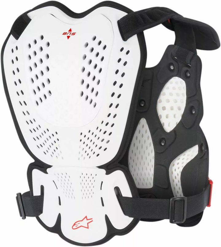 EN 14021:2003, Stone shield and back protectors are constructed from a high performance poly-material blend for optimized flexibility and excellent weight saving, The protector spastic shells are perforated for maximum breathability and cooling ventilation, Adjustable elastic closure system features a quick and easy-to-use buckles that fit a broad range of rider body types, Thermoformed padded chassis for optimized levels of comfort and close-to-the-body fit, Modular design means A-1 is optimized for use with BNS neck braces, Removable back puck for BNS neck support compatibility, Silicon BNS pull tabs for easy and safe engagement of the BNS, Removable and adjustable shoulder pads for size regulation with integrated BNS silicon pull tab, Innovative integrated Y-strap system for modular use of back protector with fast and convenient mounting, Back protector EN 1621-2:2014 Level 1., Stone shield EN 14021:2003.