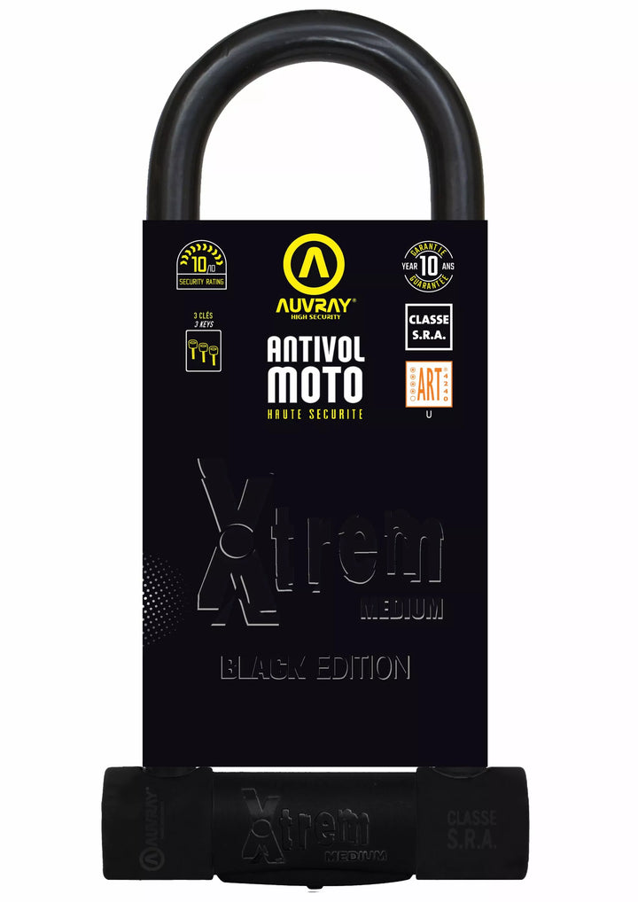 Security U-Lock, Ø 18 mm passivated hardened steel shackle, Shackle protection cover in black matte finish, Hardened steel lock body, Hardened steel double bolt locking mechanism, 7 discs hight security lock cylinder, Sawing and attack proof, pick proof cylinder, Shackle anti-rotation feature in case of cutting, ABS shell with key dirt cover, 2 flat milled keys, Key cutting service, using exclusive code number