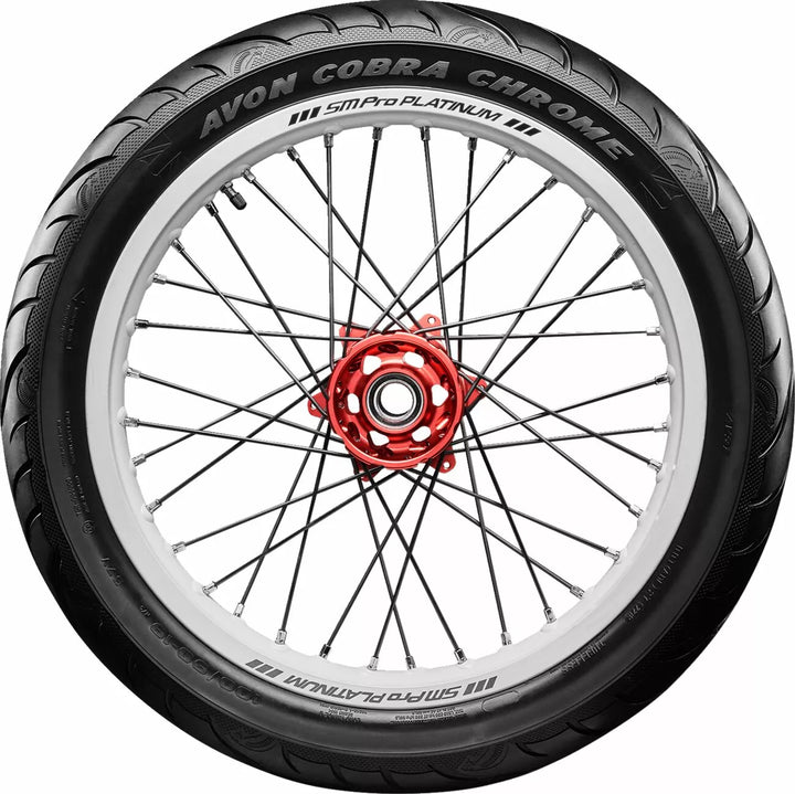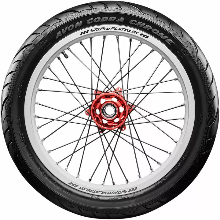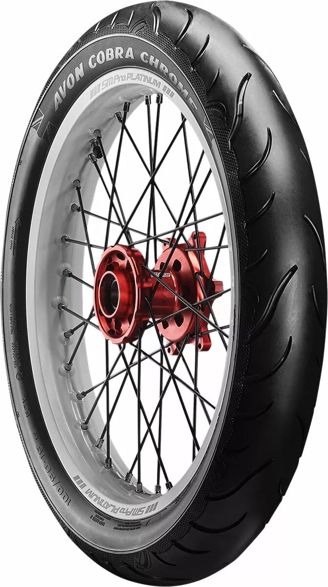 Avon's latest tech pattern and advanced construction produces over a 5% larger footprint compared to Avon Cobra, High stability in all conditions delivering precise feel and tire feedback, Better traction and shorter stopping distances, even in the wet, Incorporates sports tire technology for nimble handling, Incredible stability and longevity ヨ perfect for touring, Unique tire design with detailed aesthetic features, Improved tire life over its predecessor, Snakeskin-effect tread, Reinforced, Aimed at the power cruiser/touring/custom market.