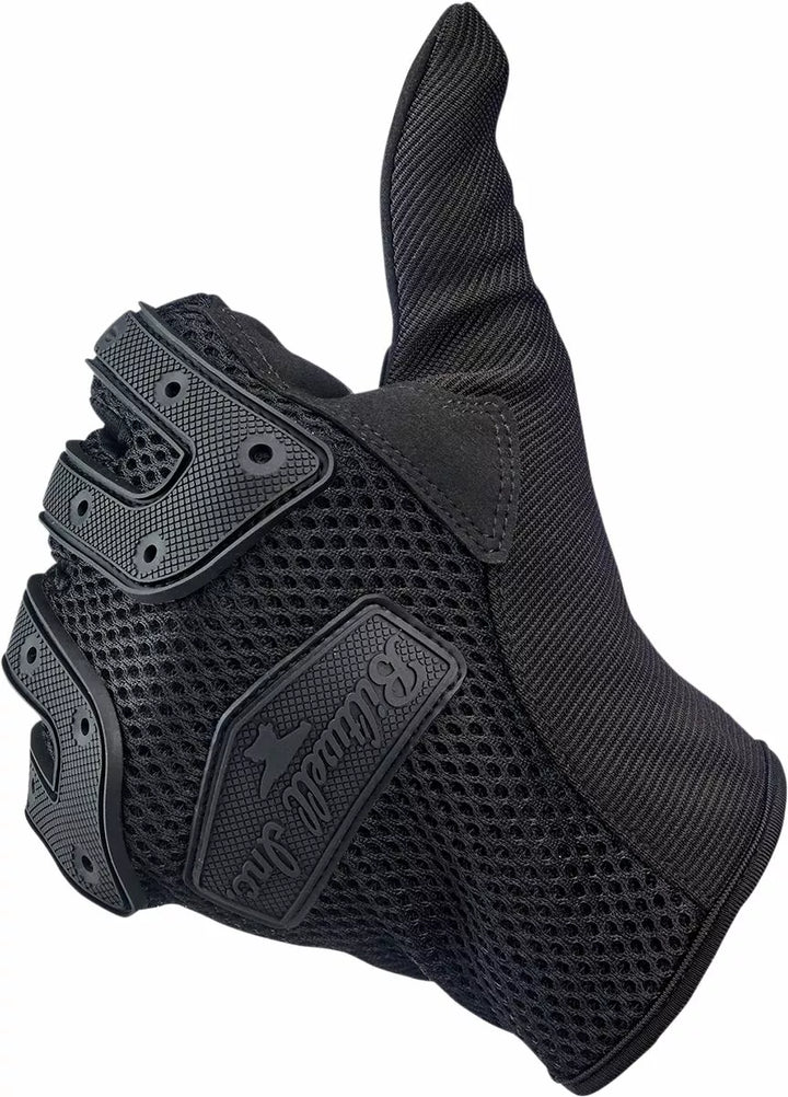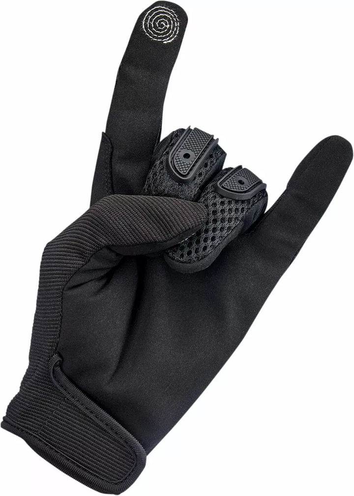 Synthetic suede palm features two-way stretch for a snug, comfortable fit, Three-ply, one-piece vented polyester back and thumb construction for maximum airflow, Flexible thermoplastic rubber knuckle guards and shield logo, Lycra® expansion panels in finger joints for dexterity, Rugged Single- and double-needle polyester stitching, Thermoplastic rubber knuckle guards on the back of the glove provide protection from rocky roost and airborne road debris, A double-stitched reinforcement panel on the thumb and index finger adds strength to the friction zone between your hands and the grips, Conductive stitching in fingers and thumb lets you operate smart screens