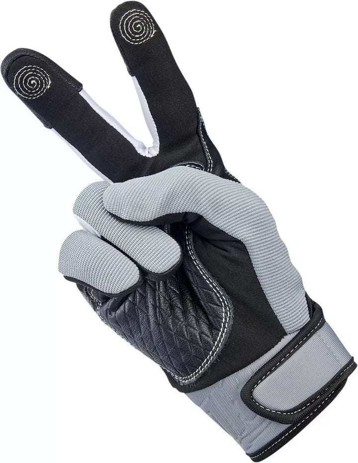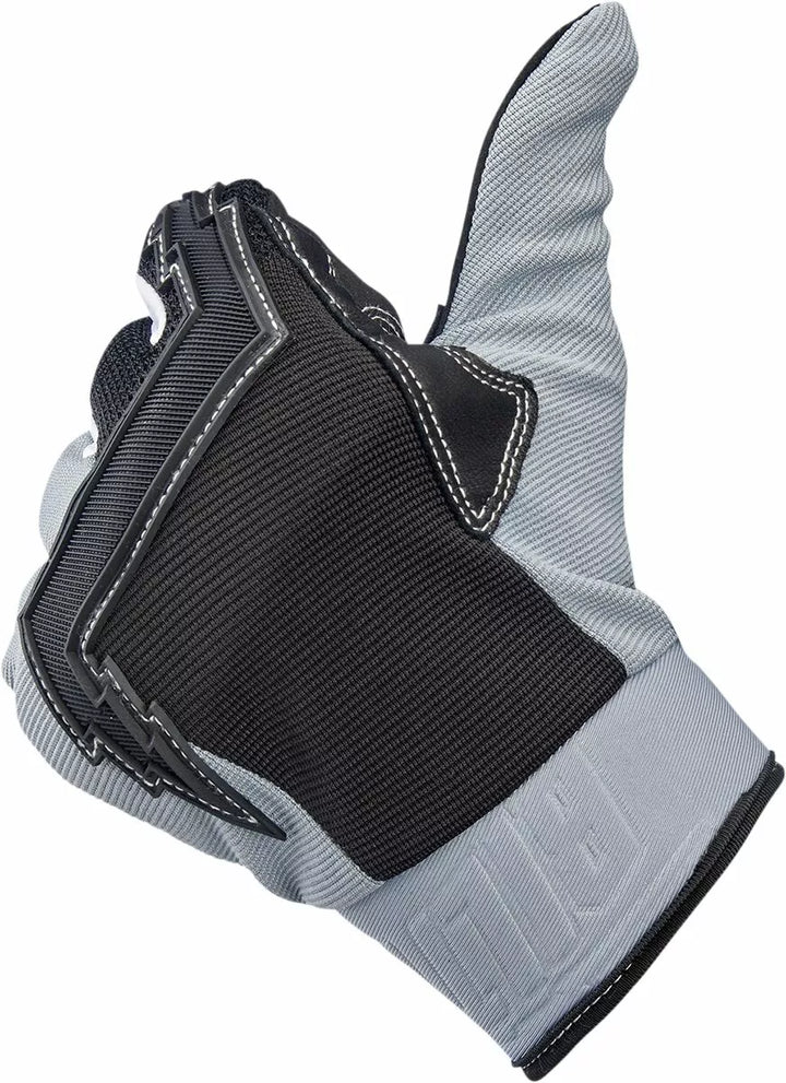 Design inspired by the 1980’s Golden Age of motocross, Goat leather palm and thumb reinforcement for added toughness in high friction areas with durable goatskin on fingertips, Synthetic suede palm and thumb construction for a snug, comfortable fit, Stretch polyester construction on ring and pinkie fingers for maximum flexibility, Three-ply woven mesh back panel for ventilation, Molded two-ply neoprene wrist wrap with adjustable Velcro closure, Lycra® expansion panels in finger joints for added dexterity, Rugged single- and double-needle polyester stitching throughout, Thermoplastic rubber lightning bolt knuckle protector, 5mm thick hidden neoprene knuckle guard, Conductive stitching in fingers and thumb lets you operate smart screen