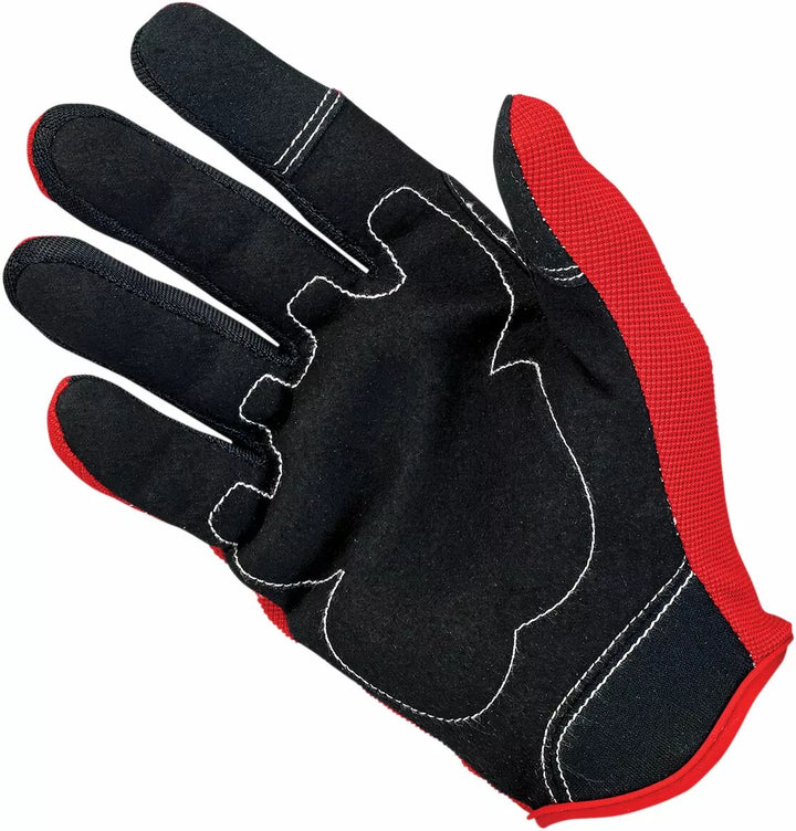 Two-way stretch polyester back panel construction for comfort, Single-layer synthetic leather palm with reinforced thumb, Adjustable wrist wrap with Velcro closure and thermoplastic rubber Biltwell shield, Lycra® expansion panels in finger joints for enhanced dexterity, Accordion baffles on finger joints for added flexibility, Rugged single- and double-needle polyester stitching, Smart screen thumb and finger tips