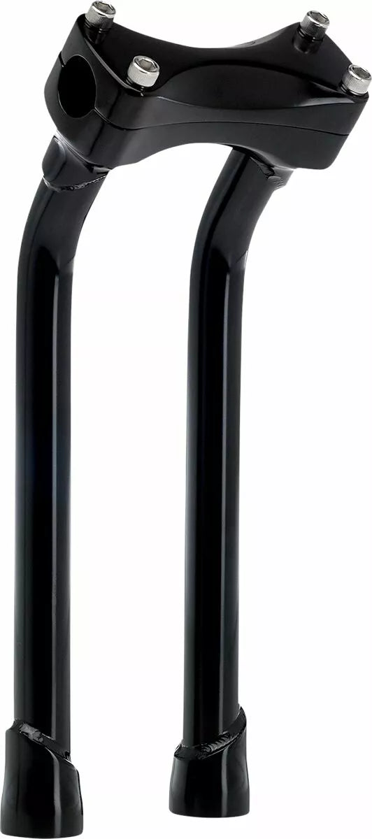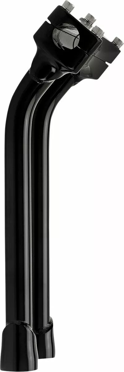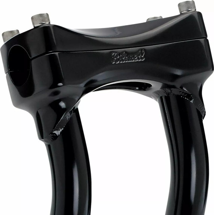 Investment-cast one-piece steel bar clamp accepts 1-1/8" O.D. handlebars, 0.120" (3 mm) wall x 1" O.D. 4130 chromoly uprights, CNC lathe-turned mounting bases accept 1/2-13 t.p.i. stock and aftermarket mounting hardware, Mounting holes on 3.5" centers to fit most stock and select aftermarket H-D fork trees, Pullback Murdock risers feature mandrel-bent uprights for two inches of rearward bar offset—perfect for reducing reach for shorter riders, TIG welded and hand polished before polishing, Stainless-steel 5/16-18 t.p.i. bar clamp hardware