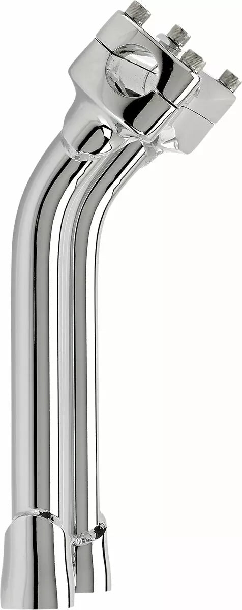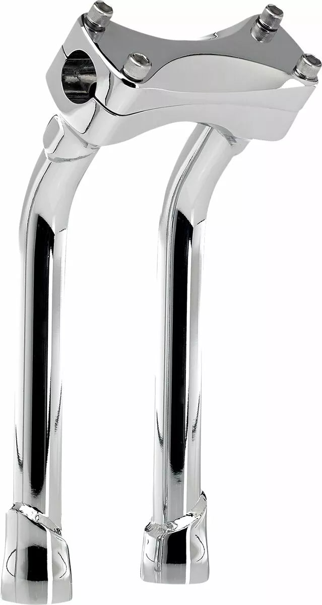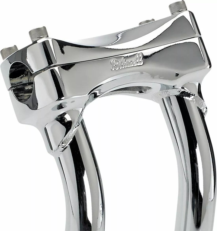 Investment-cast one-piece steel bar clamp accepts 1-1/8" O.D. handlebars, 0.120" (3 mm) wall x 1" O.D. 4130 chromoly uprights, CNC lathe-turned mounting bases accept 1/2-13 t.p.i. stock and aftermarket mounting hardware, Mounting holes on 3.5" centers to fit most stock and select aftermarket H-D fork trees, Pullback Murdock risers feature mandrel-bent uprights for two inches of rearward bar offset—perfect for reducing reach for shorter riders, TIG welded and hand polished before polishing, Stainless-steel 5/16-18 t.p.i. bar clamp hardware