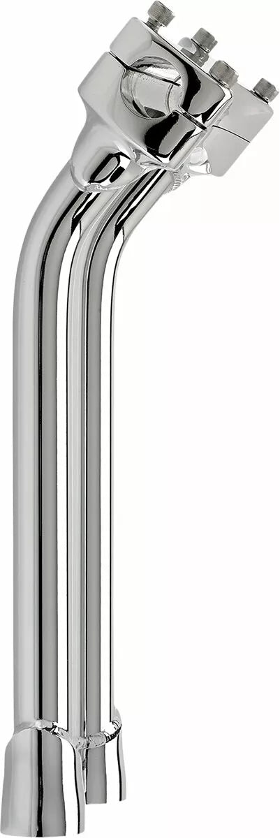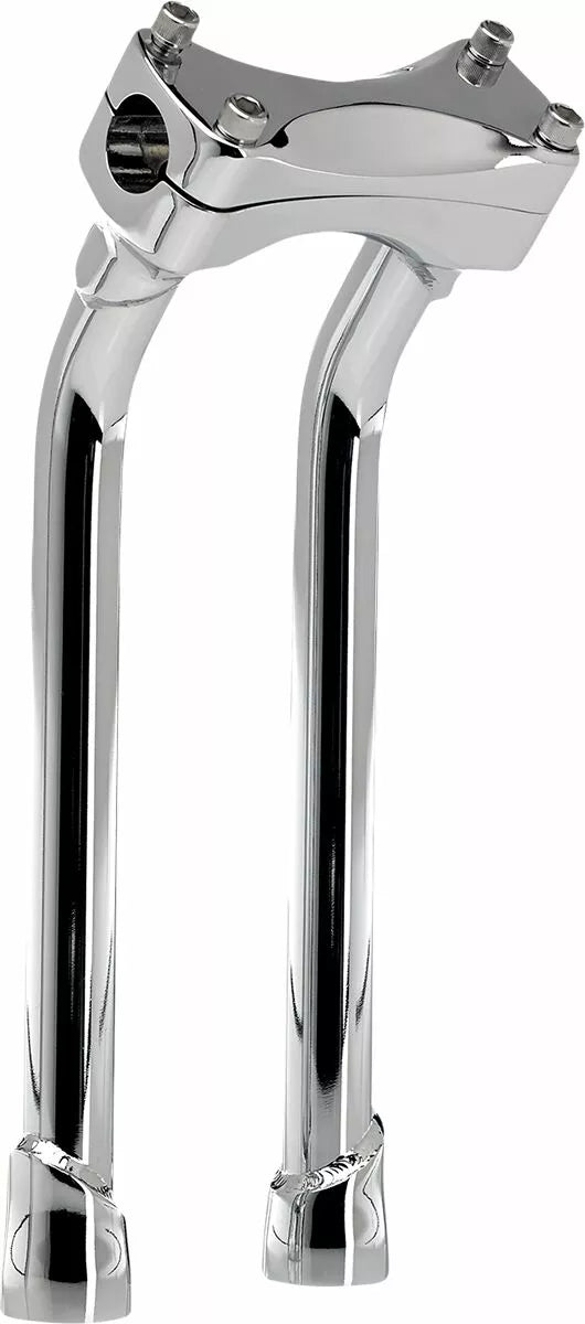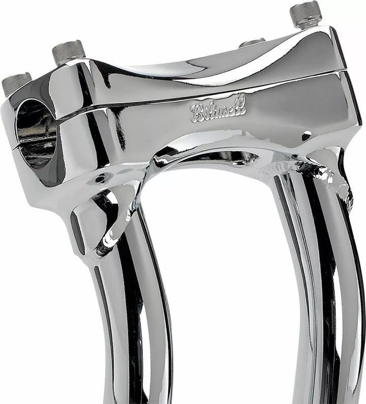 Investment-cast one-piece steel bar clamp accepts 1-1/8" O.D. handlebars, 0.120" (3 mm) wall x 1" O.D. 4130 chromoly uprights, CNC lathe-turned mounting bases accept 1/2-13 t.p.i. stock and aftermarket mounting hardware, Mounting holes on 3.5" centers to fit most stock and select aftermarket H-D fork trees, Pullback Murdock risers feature mandrel-bent uprights for two inches of rearward bar offset—perfect for reducing reach for shorter riders, TIG welded and hand polished before polishing, Stainless-steel 5/16-18 t.p.i. bar clamp hardware