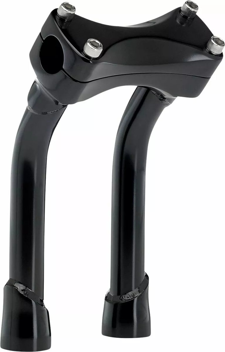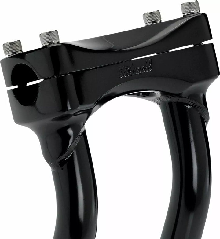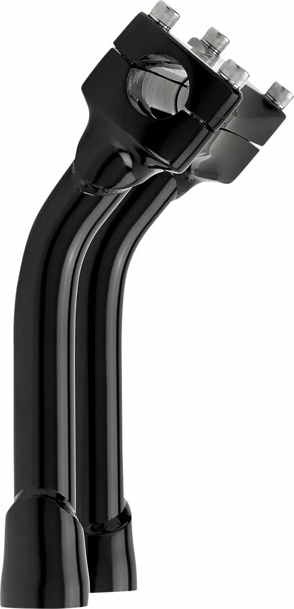 Investment-cast one-piece steel bar clamp accepts 1-1/8" O.D. handlebars, 0.120" (3 mm) wall x 1" O.D. 4130 chromoly uprights, CNC lathe-turned mounting bases accept 1/2-13 t.p.i. stock and aftermarket mounting hardware, Mounting holes on 3.5" centers to fit most stock and select aftermarket H-D fork trees, Pullback Murdock risers feature mandrel-bent uprights for two inches of rearward bar offset—perfect for reducing reach for shorter riders, TIG welded and hand polished before polishing, Stainless-steel 5/16-18 t.p.i. bar clamp hardware
