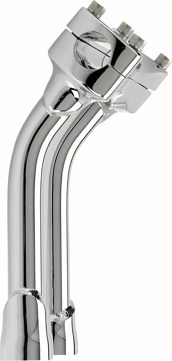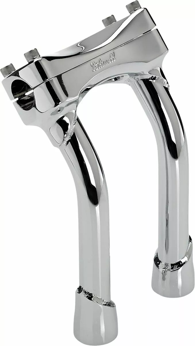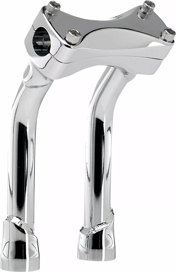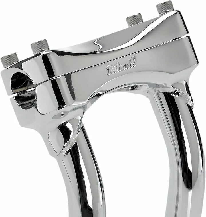 Investment-cast one-piece steel bar clamp accepts 1-1/8" O.D. handlebars, 0.120" (3 mm) wall x 1" O.D. 4130 chromoly uprights, CNC lathe-turned mounting bases accept 1/2-13 t.p.i. stock and aftermarket mounting hardware, Mounting holes on 3.5" centers to fit most stock and select aftermarket H-D fork trees, Pullback Murdock risers feature mandrel-bent uprights for two inches of rearward bar offset—perfect for reducing reach for shorter riders, TIG welded and hand polished before polishing, Stainless-steel 5/16-18 t.p.i. bar clamp hardware