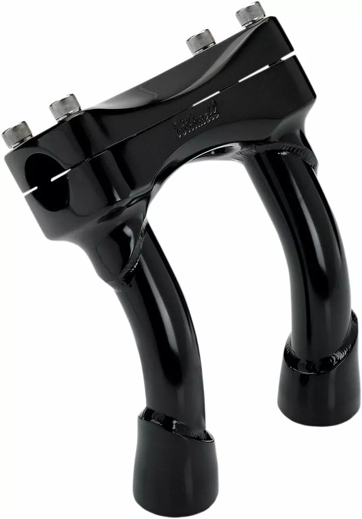 Investment-cast steel one-piece top clamp, TIG welded 0.120" wall 4130 chromoly steel uprights with 1/2"-13 threads, Handlebar clamp bolt patterns fit speedo/tach brackets on many stock model year Harleys, For 1" bars