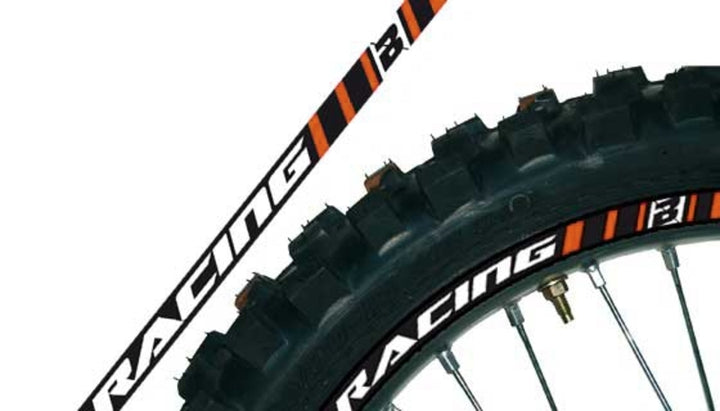 The kit is composed of 8 front rim stickers and 8 rear rim stickers, plus 2 spare parts. It allows to decorate the rim side with adhesive stripes specifically shaped. It can be applied on 17'', 18'', 19'' and 21'' rims. For minicross, the stickers need to be cut at the ends in order to adapt them to the lower diameter of the rims. Color: Orange