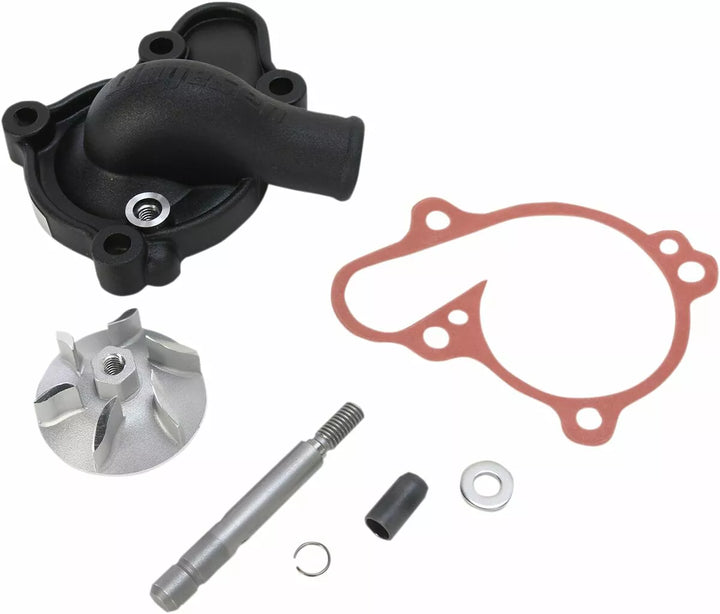 An aluminum investment-cast water pump cover and impeller combo; specifically designed to enhance the performance of your engineメs cooling system, High-flow, hydrodynamic water pump kit has been tested and designed to flow more coolant, By increasing the flow at all rpm ranges, the engine will run cooler at a more constant temperature, Nautilus-style impeller for hydrodynamic efficiency, Extend engine life