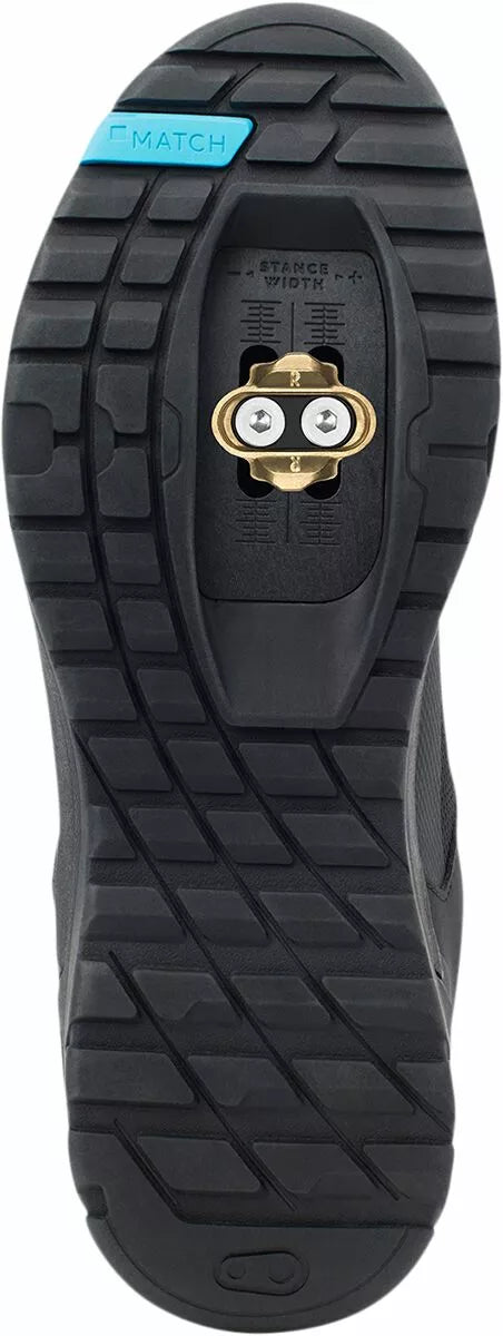 Classic lace closure system offers smooth closure with round laces and a pocket to safely tuck laces, Match Box optimized for any MTB/SPD pedals, Ramp for easy clip-in/out and mud clearance, Match shim and Crankbrothers cleat pre-installed in a neutral position so they are ready to ride with Crankbrothers pedals (sold separately) right out of the box, MC1 mid-friction compound for easy exit, Directional angled and spaced toe/heel lugs for traction while hiking, Ramped toe for walkability, Stiff shank for power transfer, Cushioned EVA midsole for shock absorption, Ventilated windows with perforated mesh material for breathability, Padded tongue for protection, TPU reinforced areas for protection and abrasion resistance, Heel dots for grip and superior heel hold, Hidden eyelets for durability and clean design