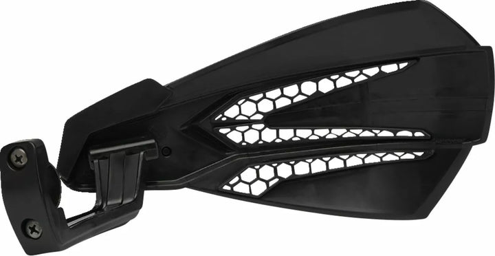 Open handguards with universal mounting brackets, Maximum protection from track/trail debris, Dual-injection for increased impact resistance, Flexible/lightweight/strong, Two horizontal positions, Built-in ventilation, Bracket can mount above or below lever, Universal fitment for all mx/enduro style handlebars 125cc and up