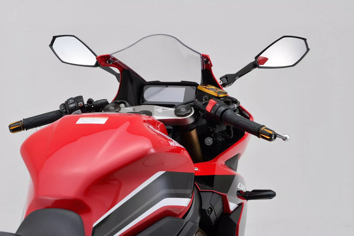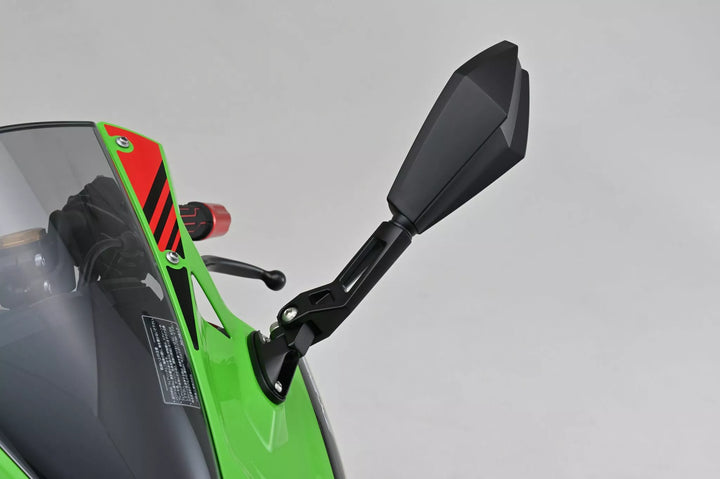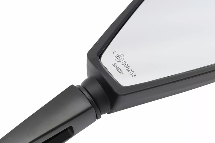 ECE-approved., Material mirror head: ABS, Material mirror arm: aluminum, One black mirror for the right/left side to mount at the handle/fairing