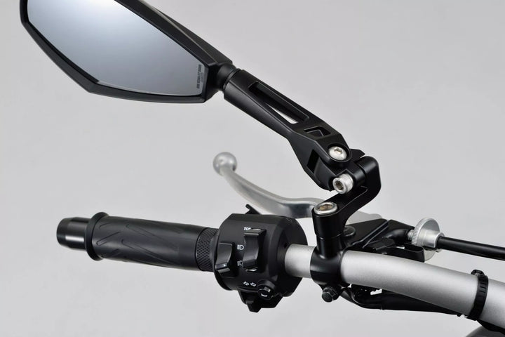 ECE-approved., Material mirror head: ABS, Material mirror arm: aluminum, One black mirror for the right/left side to mount at the handle/fairing