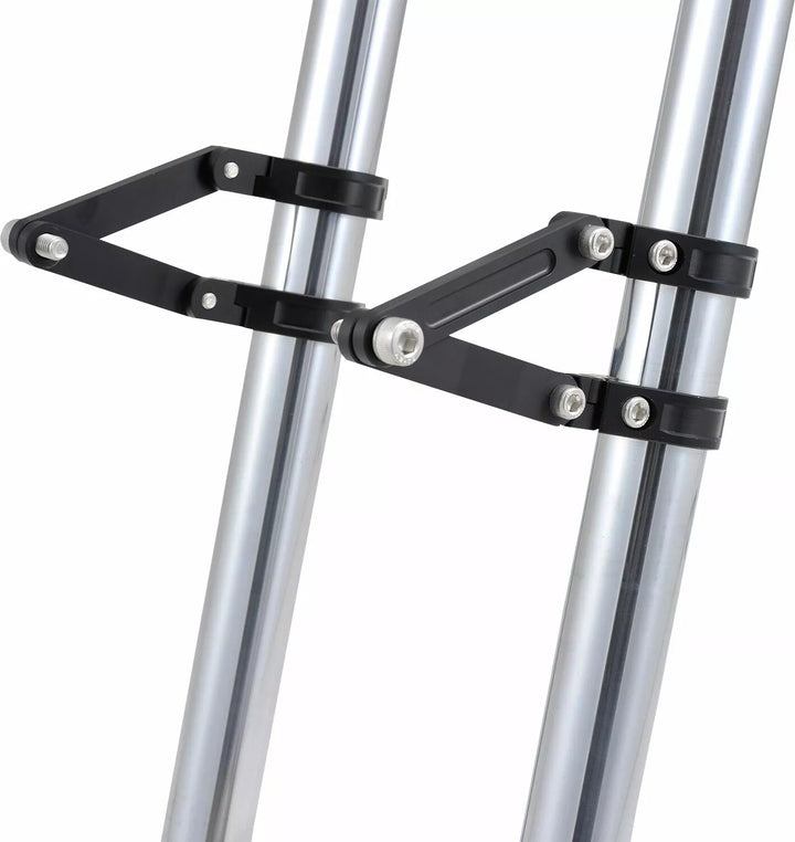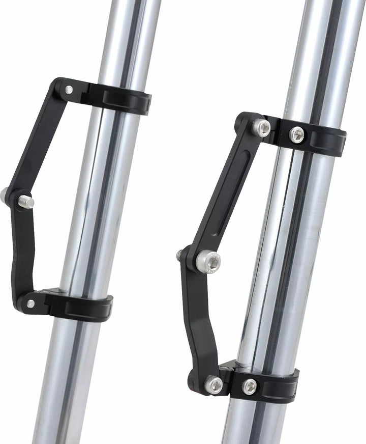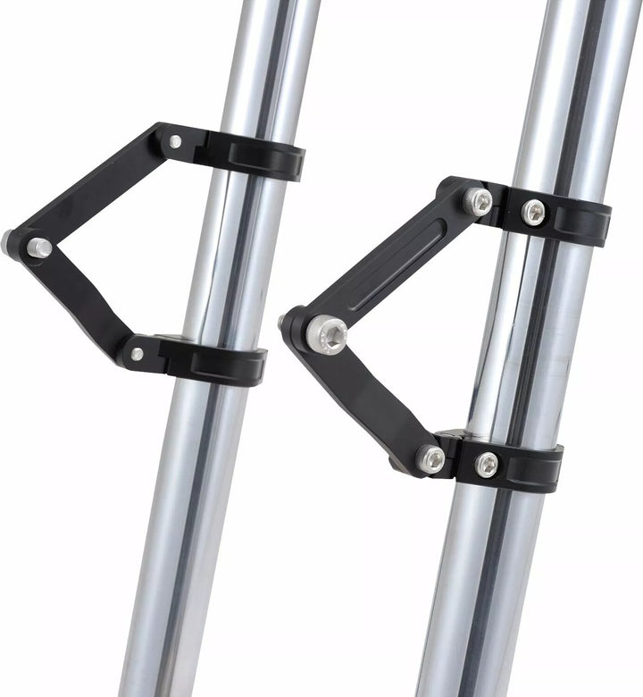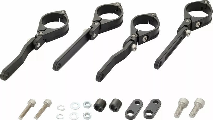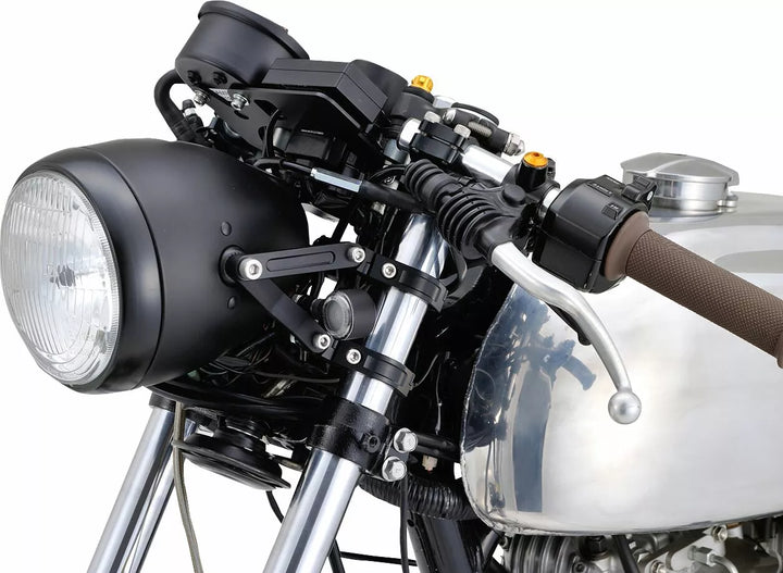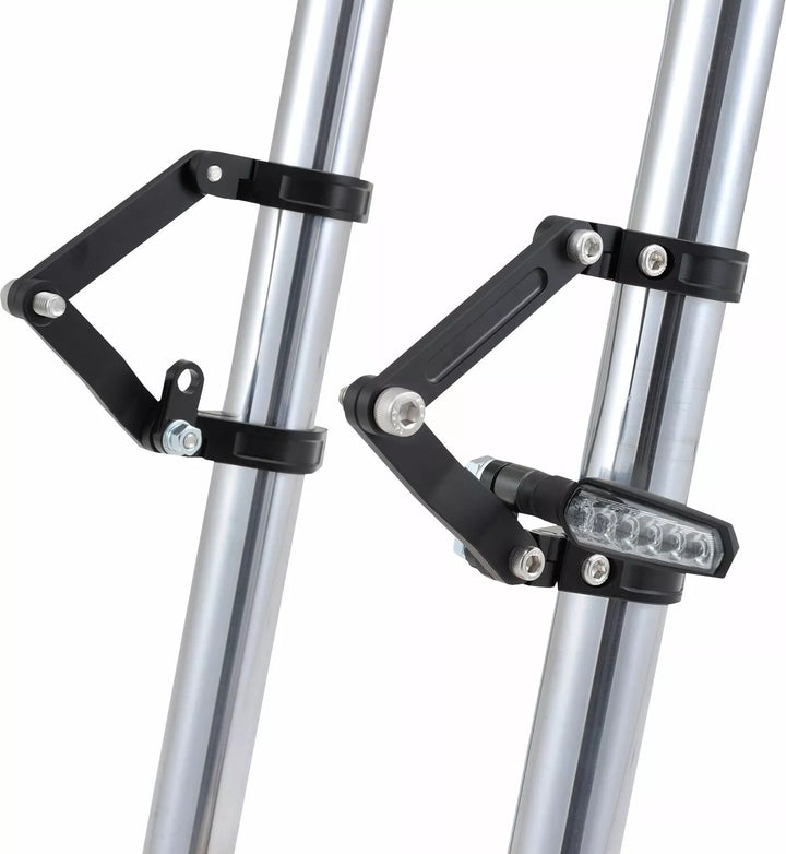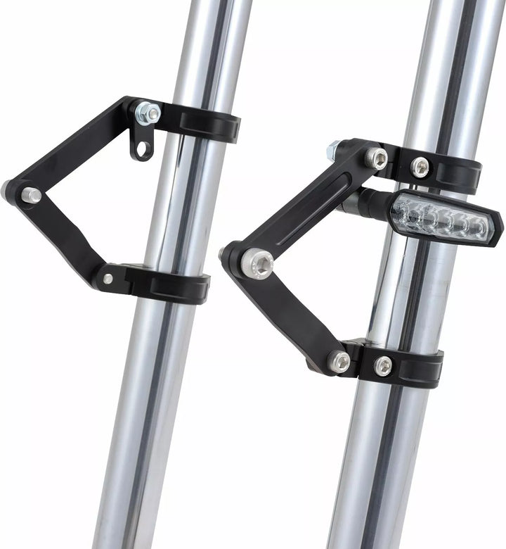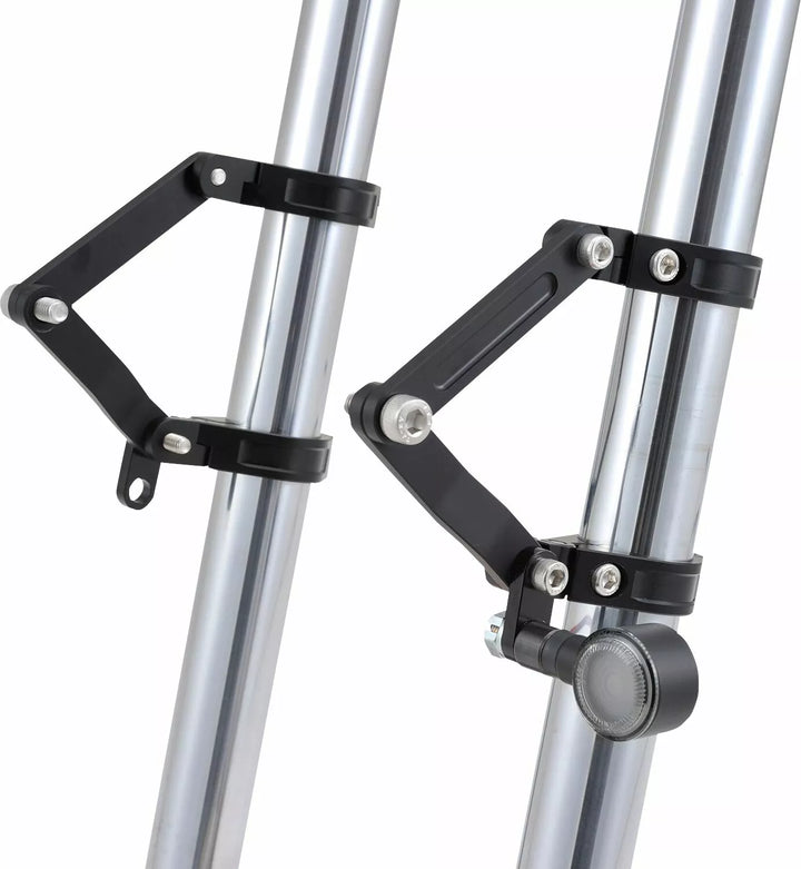 Adjustable dual-axis headlight bracket made of CNC machined aluminium in black, The fork clamp can be adjusted vertically, allowing the headlight position to be adjusted in the front-back direction, Joints on all four clamps allow the width of the headlight mount to be varied and the braces to run parallel, M8 indicator mount kit is included for discreet installation