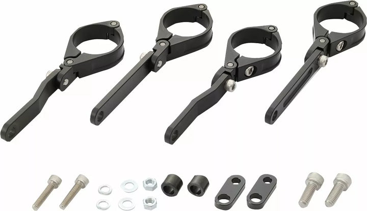 Adjustable dual-axis headlight bracket made of CNC machined aluminium in black, The fork clamp can be adjusted vertically, allowing the headlight position to be adjusted in the front-back direction, Joints on all four clamps allow the width of the headlight mount to be varied and the braces to run parallel, M8 indicator mount kit is included for discreet installation