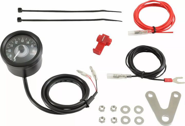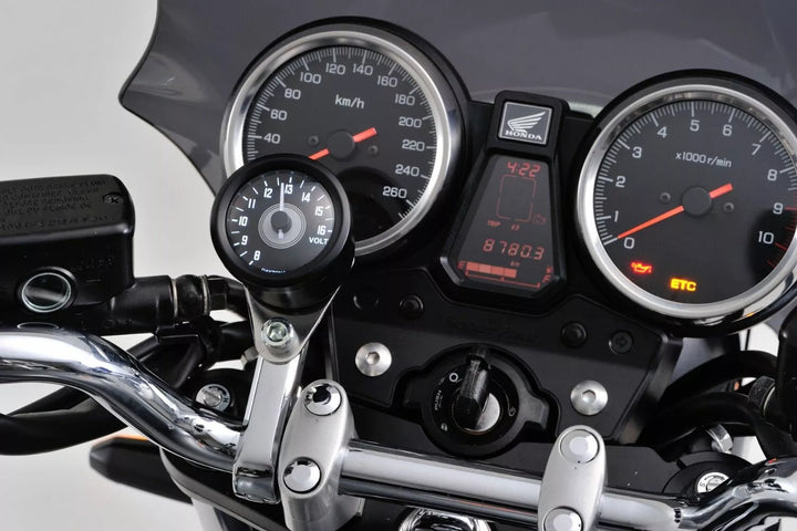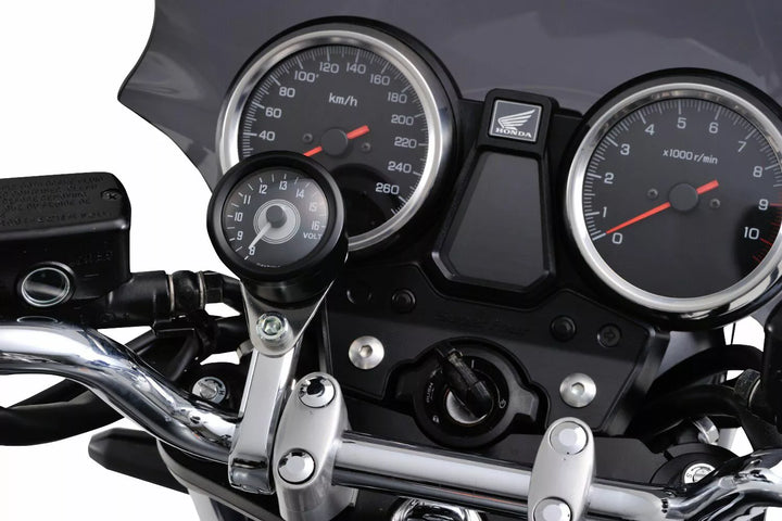 High quality analog VELONA48 voltmeter for monitoring the battery voltage of the motorcycle, Stepper motor with precise volt display, Voltmeter Range: 8,0 - 16,0V, Battery warning: Low voltage alert by Red LED backlight when less than 12V, Stainless steel housing, Incl. V-shaped bracket